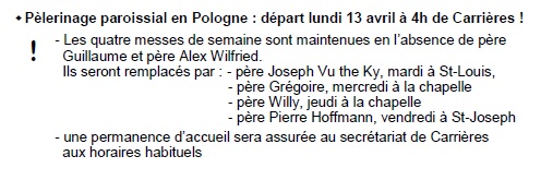 | 13.04 | Départ du pèlerinage en Pologne | Plus d'infos dans l'Arc-en-Ciel | ||