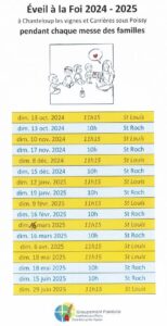 L’Éveil à la foi se déroule un dimanche par mois hors vacances scolaires à l’église Saint-Louis, pendant la messe des familles de 11h15 (en général le 2e dimanche du mois). L’accueil se fait dès 11h dans la salle Saint-Jean attenante à l’église. Puis les enfants rejoignent l’église au moment de la communion et présentent leur activité à l’assemblée. Première séance 2025-26 le 12 octobre.
