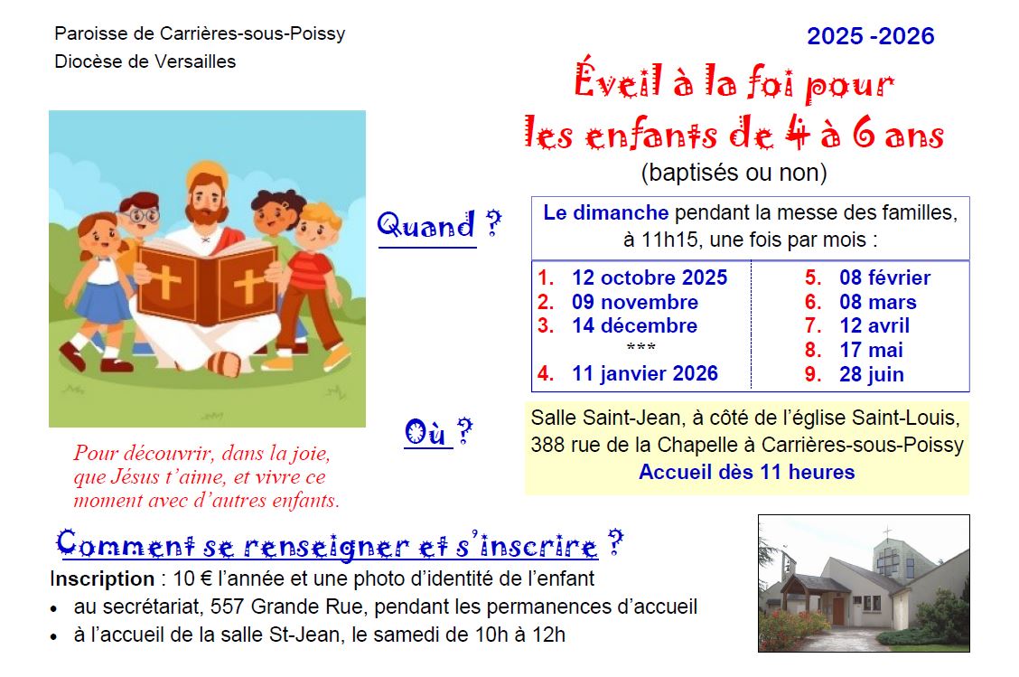L’Éveil à la foi se déroule un dimanche par mois hors vacances scolaires à l’église Saint-Louis, pendant la messe des familles de 11h15 (en général le 2e dimanche du mois). L’accueil se fait dès 11h dans la salle Saint-Jean attenante à l’église. Puis les enfants rejoignent l’église au moment de la communion et présentent leur activité à l’assemblée. Première séance 2025-26 le 12 octobre.