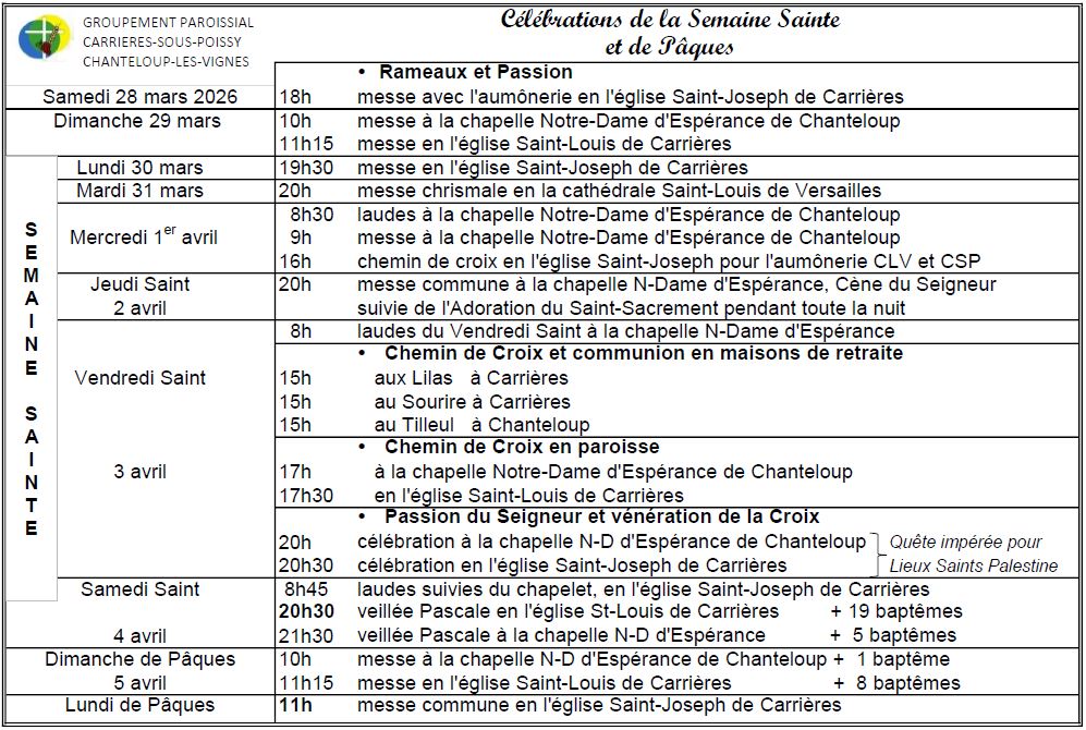 2 - Agenda du mois, 4 - À noter sur vos tablettes Semaine Sainte Groupement Paroissial 24/03/2026 Retrouvez ci-dessous tous les horaires de la Semaine Sainte ← Des changements dans la communauté Cimko Un Concile dans notre Église d’Ile-de-France →