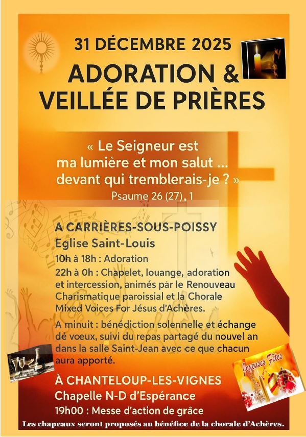 4 - À noter sur vos tablettes Veillée de la Saint-Sylvestre Groupement Paroissial 08/12/2025 Nous vous proposons de vivre une journée d’Adoration et d’action de grâce le 31 décembre. Au programme dans nos paroisses : Adoration du Saint-Sacrement, messe d’action de grâce, veillée de prière, échange de vœux et repas partagé. ← Un nouveau groupe Culture en Église